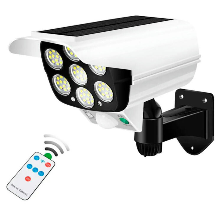 Автономный муляж камеры со встроенным аккумулятором, солнечной батареей, датчиком движения и 7 фонарями белого света. Отлично подходит для организации освещения и профилактики правонарушений. Имеет защиту от осадков и имеет высокое сходство с камерами видеонаблюдения. Благодаря встроенной батареи, подключенной к солнечной панели, не требуется заботится о питании устройства и тратить деньги на батарейки. При хорошей солнечной погоде устройство накапливает энергию от солнечной панели и заряжает внутренний аккумулятор емкостью 2400мАч. Устройство может экономно расходовать накопленный заряд с помощью интегрированной логике работы по специальным режимам. Имеется экономный режим света 40Лм и основной 800Лм. Последний включается лишь при детекции движения на 30 секунд. Муляж может эксплуатироваться в трех режимах работы: Автоматическое включение LED подсветки "эконом" (40Лк) в ночное время и при срабатывании детекции движения на расстоянии до 3-6 метров на 20-25 секунд включение "основного" света (800Лк), затем автоматическое переключение на "эконом" свет. Без включения LED подсветки "эконом" в ночное время, НО включение "основной" (800Лк) подсветки при детекции движения на 20-25 секунд Автоматическое включение LED подсветки в "основном" режиме яркости (800Лк) в ночное время при срабатывании детекции движения на расстоянии до 3-6 метров на 20-25 секунд, но через 4 часа работы автоматическое переключение в "экономный" режим света.